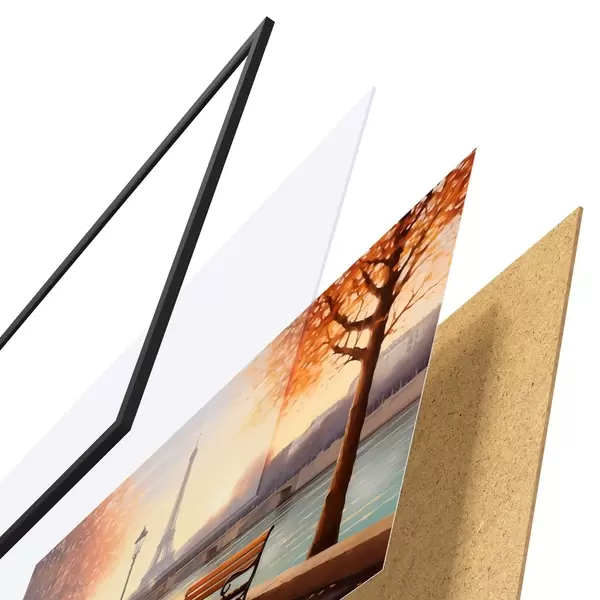 Le poster se compose d'un cadre, d'un plexiglas, d'une image imprimée et d'un support en aggloméré. Le poster peut être immédiatement accroché au mur grâce aux fixations au dos.