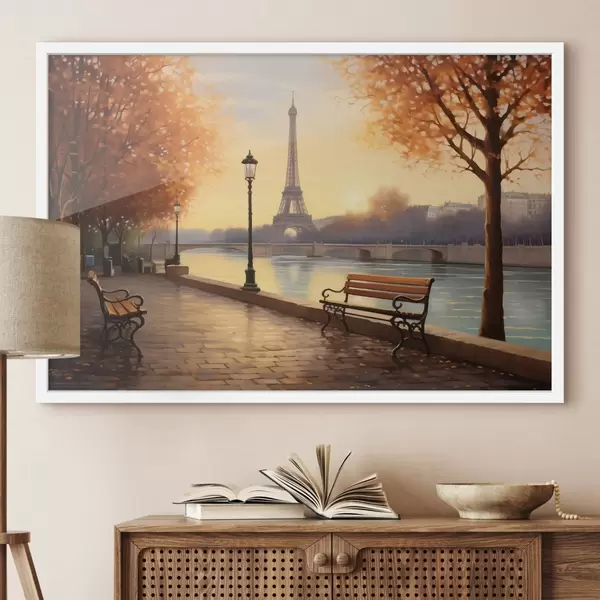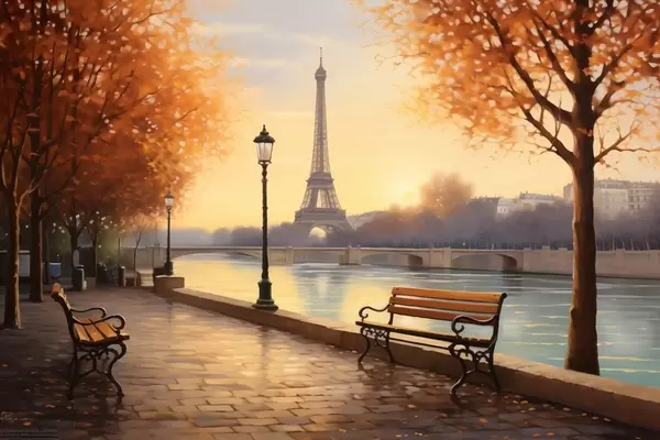 Affiche L'automne à Paris avec vue sur la tour Eiffel, les berges de la Seine recouvertes de feuilles, les bancs et les lampadaires qui ajoutent une touche romantique. f42577