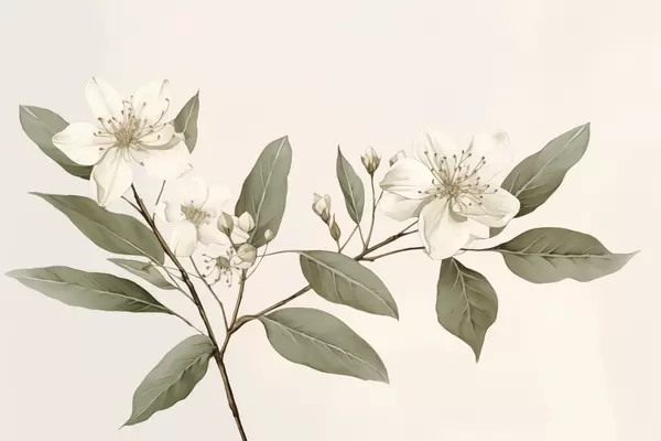 Affiche Une branche délicate avec des fleurs blanches et des feuilles vertes sur un fond clair, avec des détails doux et un style élégant. f42583