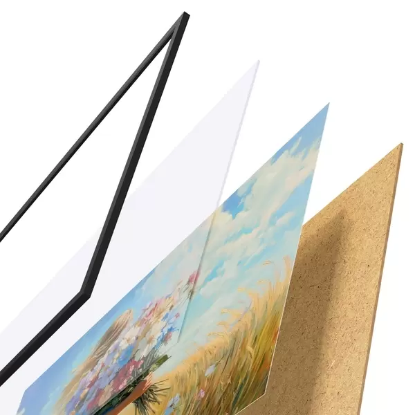 Le poster se compose d'un cadre, d'un plexiglas, d'une image imprimée et d'un support en aggloméré. Le poster peut être immédiatement accroché au mur grâce aux fixations au dos.