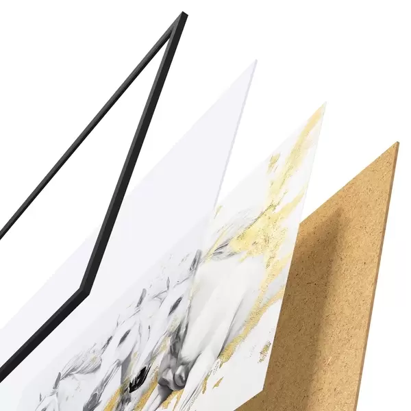 Le poster se compose d'un cadre, d'un plexiglas, d'une image imprimée et d'un support en aggloméré. Le poster peut être immédiatement accroché au mur grâce aux fixations au dos.