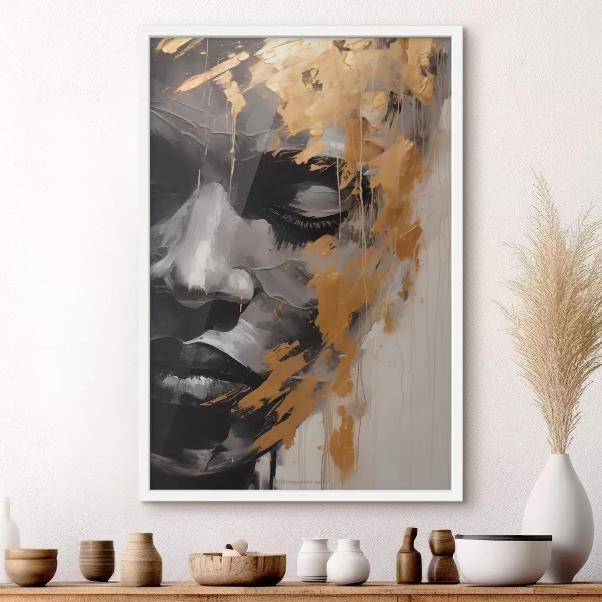 Affiche Portrait abstrait d'une femme en noir et blanc avec des coups de pinceau audacieux de couleurs chaudes qui ajoutent du contraste et de la profondeur émotionnelle. Non f42622