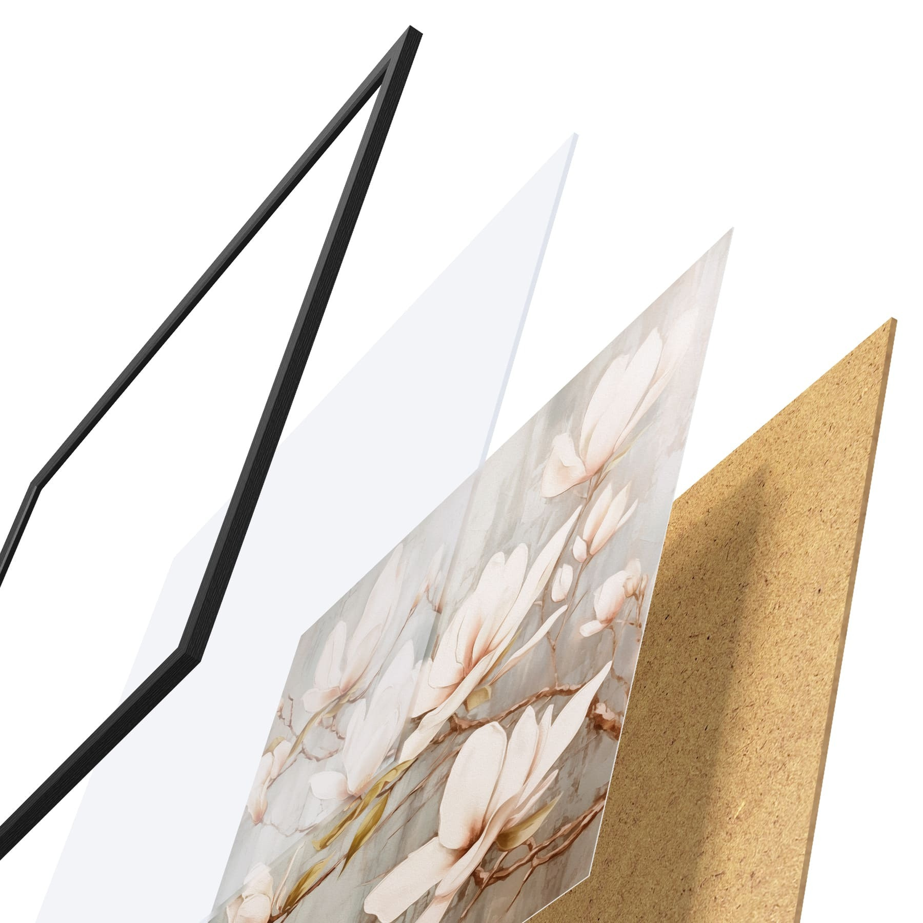 Le poster se compose d'un cadre, d'un plexiglas, d'une image imprimée et d'un support en aggloméré. Le poster peut être immédiatement accroché au mur grâce aux fixations au dos.