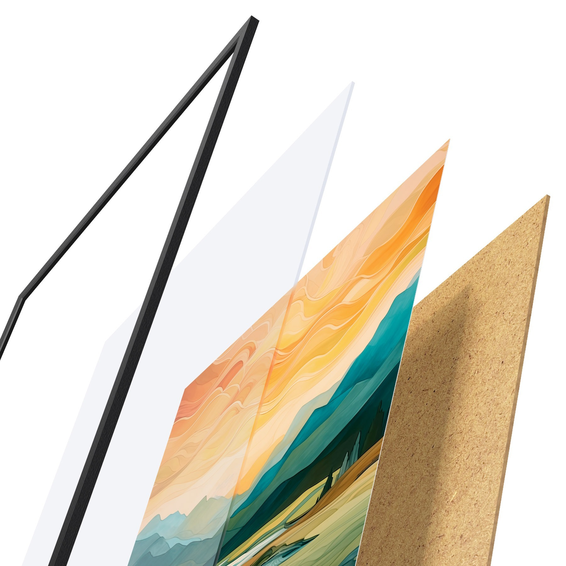 Le poster se compose d'un cadre, d'un plexiglas, d'une image imprimée et d'un support en aggloméré. Le poster peut être immédiatement accroché au mur grâce aux fixations au dos.