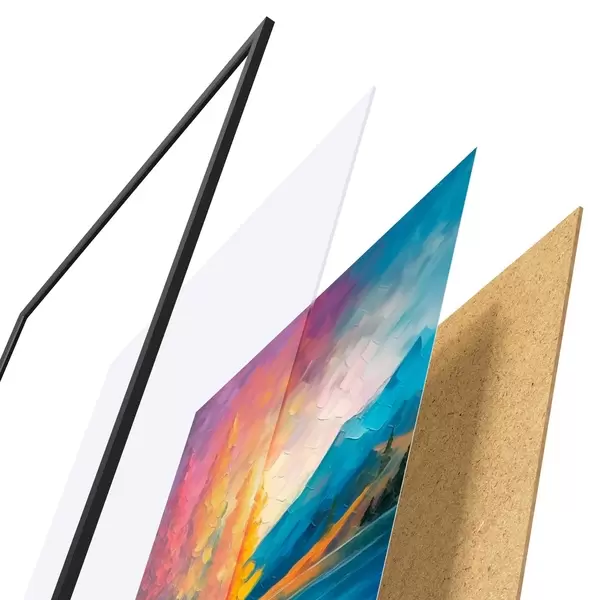 Le poster se compose d'un cadre, d'un plexiglas, d'une image imprimée et d'un support en aggloméré. Le poster peut être immédiatement accroché au mur grâce aux fixations au dos.