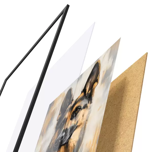 Le poster se compose d'un cadre, d'un plexiglas, d'une image imprimée et d'un support en aggloméré. Le poster peut être immédiatement accroché au mur grâce aux fixations au dos.