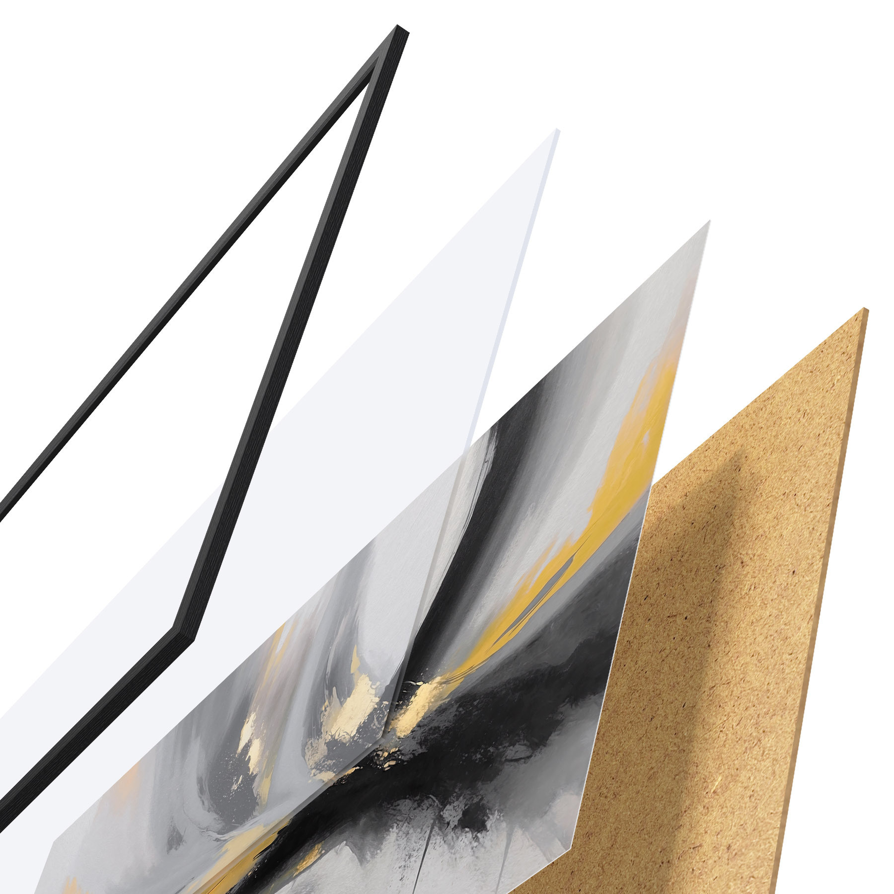Le poster se compose d'un cadre, d'un plexiglas, d'une image imprimée et d'un support en aggloméré. Le poster peut être immédiatement accroché au mur grâce aux fixations au dos.