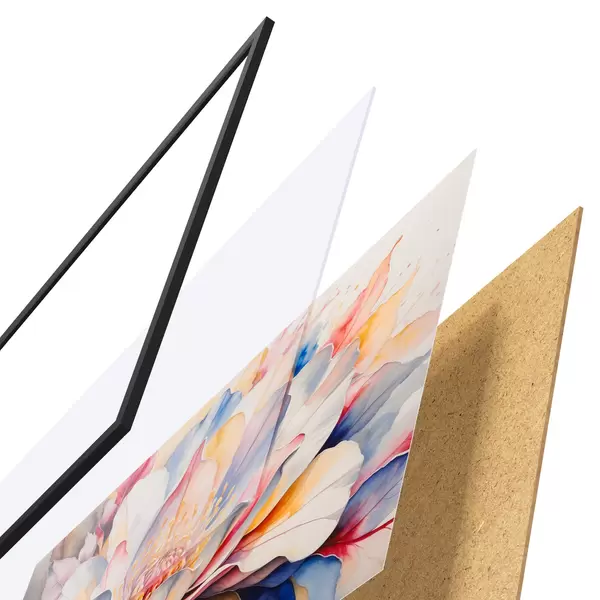 Le poster se compose d'un cadre, d'un plexiglas, d'une image imprimée et d'un support en aggloméré. Le poster peut être immédiatement accroché au mur grâce aux fixations au dos.