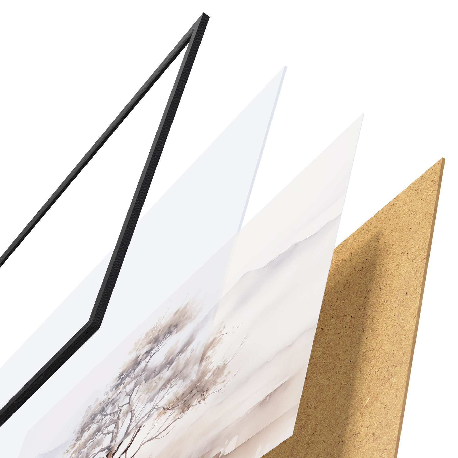 Le poster se compose d'un cadre, d'un plexiglas, d'une image imprimée et d'un support en aggloméré. Le poster peut être immédiatement accroché au mur grâce aux fixations au dos.
