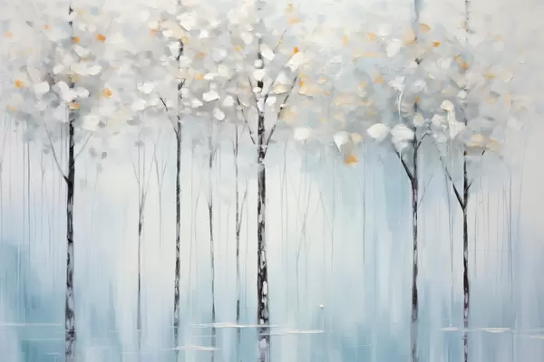 Affiche Grands arbres élancés avec des feuilles bleues et des touches de jaune sur un fond bleu tendre, imitation peinture à l'huile Non f42731