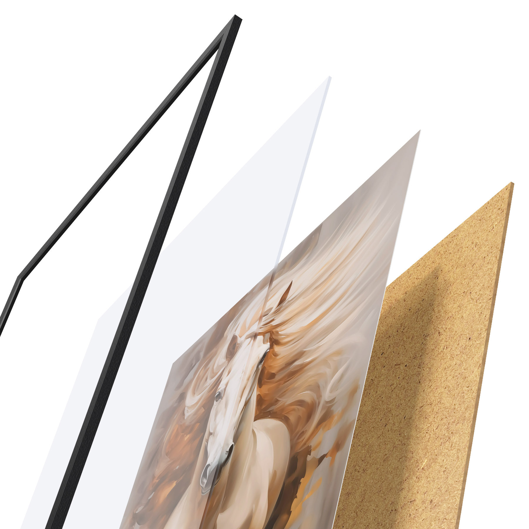 Le poster se compose d'un cadre, d'un plexiglas, d'une image imprimée et d'un support en aggloméré. Le poster peut être immédiatement accroché au mur grâce aux fixations au dos.