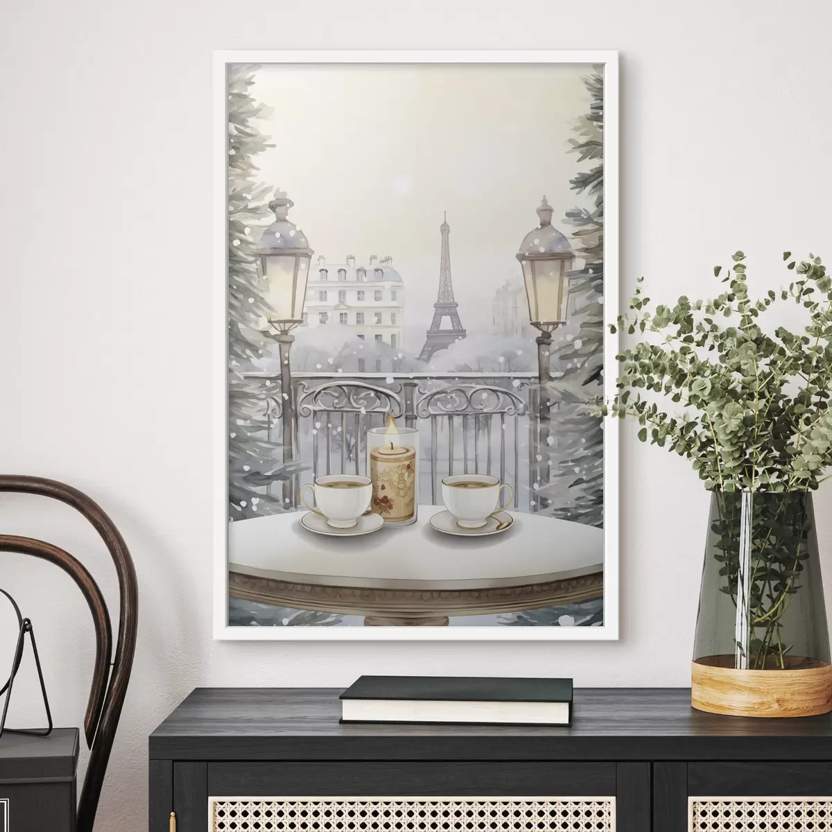 Affiche Beau café à Paris, tasses de thé, vue romantique, hiver, style aquarelle f42799