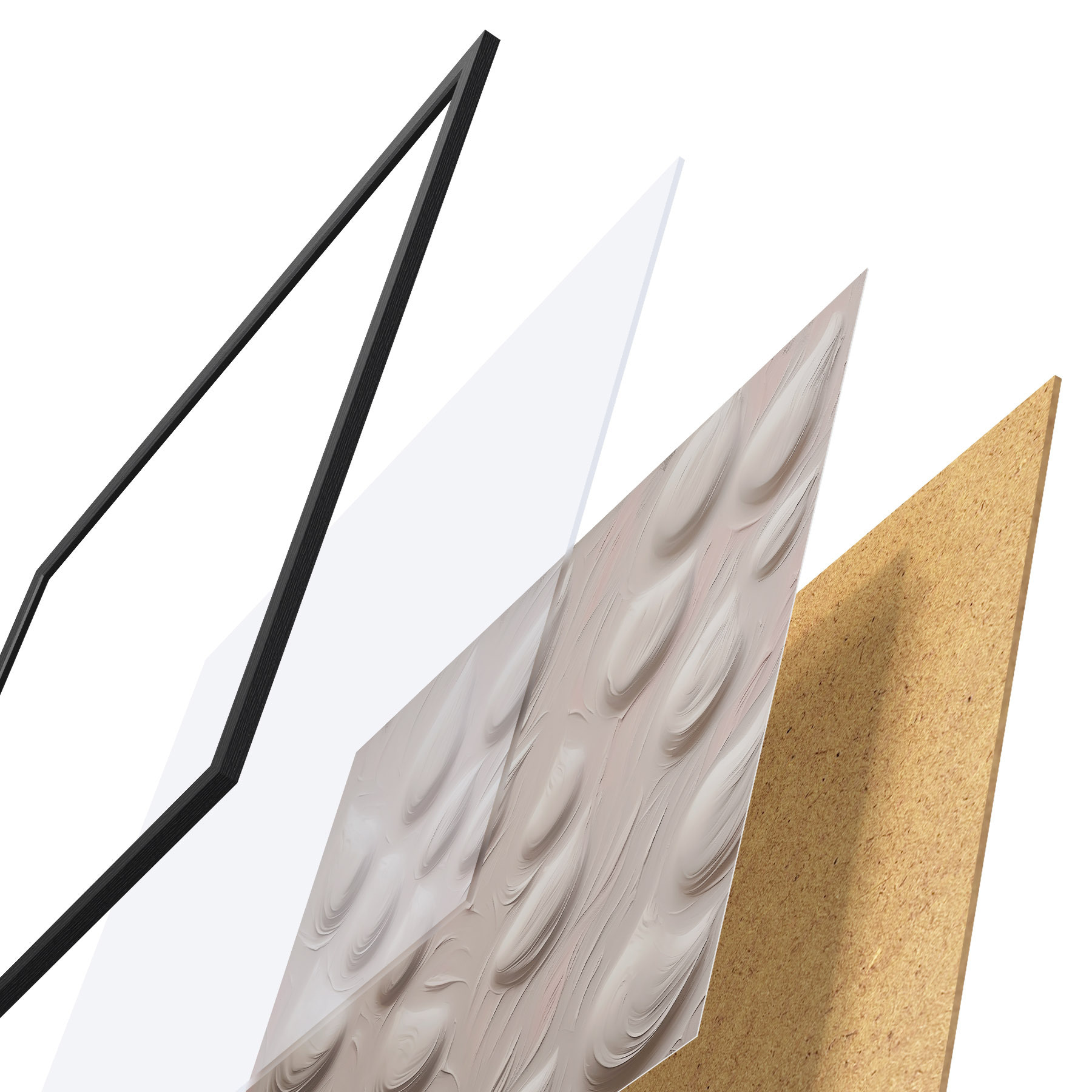Le poster se compose d'un cadre, d'un plexiglas, d'une image imprimée et d'un support en aggloméré. Le poster peut être immédiatement accroché au mur grâce aux fixations au dos.