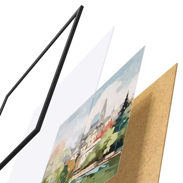 Le poster se compose d'un cadre, d'un plexiglas, d'une image imprimée et d'un support en aggloméré. Le poster peut être immédiatement accroché au mur grâce aux fixations au dos.