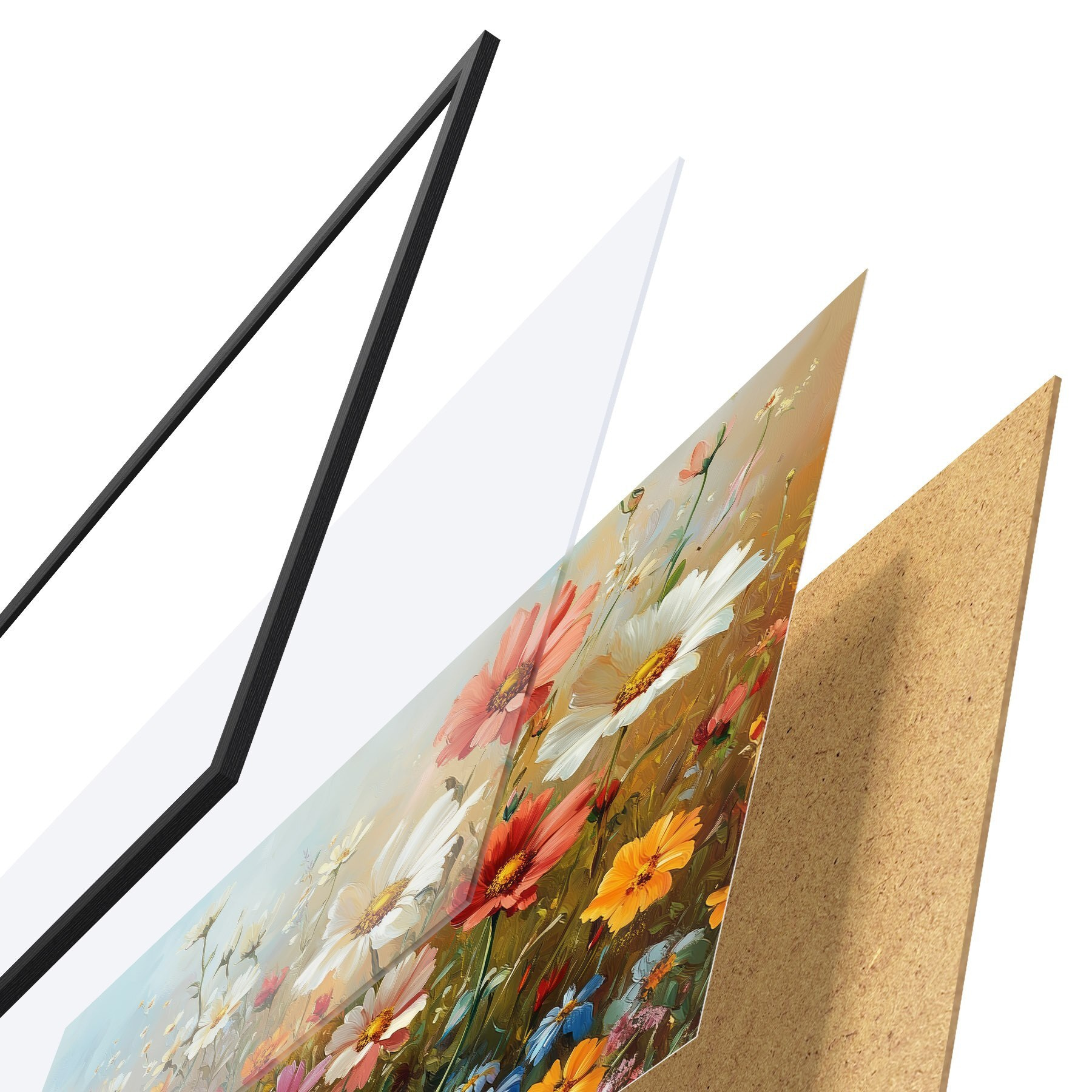 Le poster se compose d'un cadre, d'un plexiglas, d'une image imprimée et d'un support en aggloméré. Le poster peut être immédiatement accroché au mur grâce aux fixations au dos.