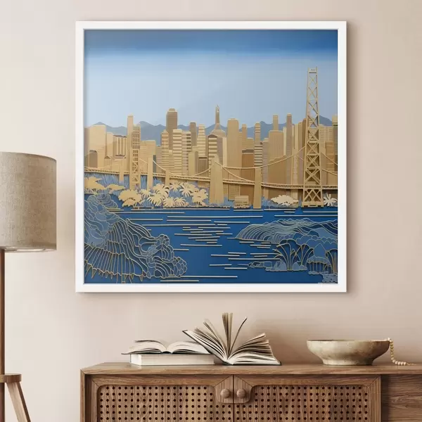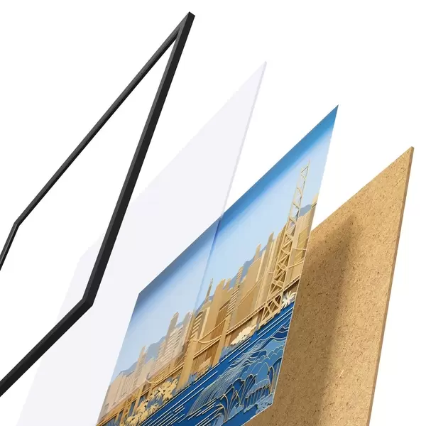Le poster se compose d'un cadre, d'un plexiglas, d'une image imprimée et d'un support en aggloméré. Le poster peut être immédiatement accroché au mur grâce aux fixations au dos.