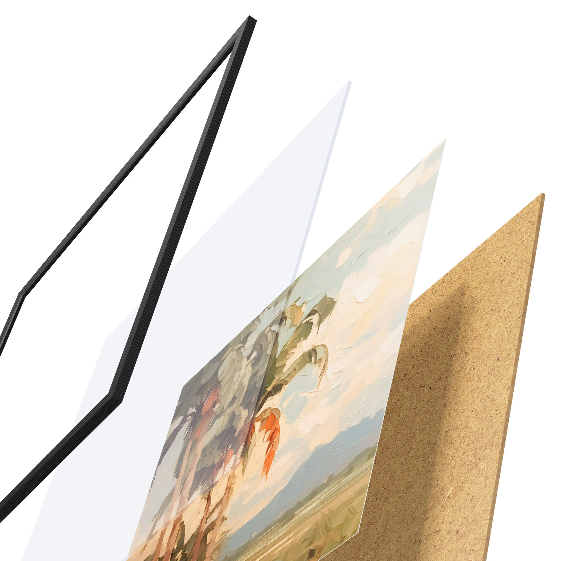 Le poster se compose d'un cadre, d'un plexiglas, d'une image imprimée et d'un support en aggloméré. Le poster peut être immédiatement accroché au mur grâce aux fixations au dos.