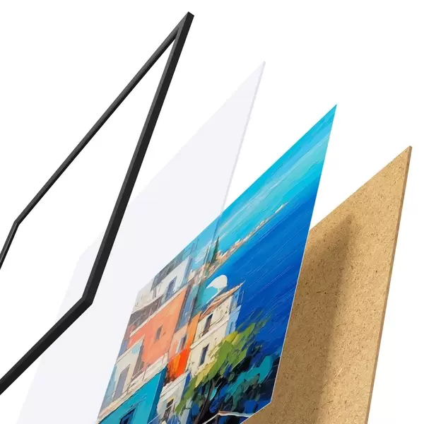 Le poster se compose d'un cadre, d'un plexiglas, d'une image imprimée et d'un support en aggloméré. Le poster peut être immédiatement accroché au mur grâce aux fixations au dos.