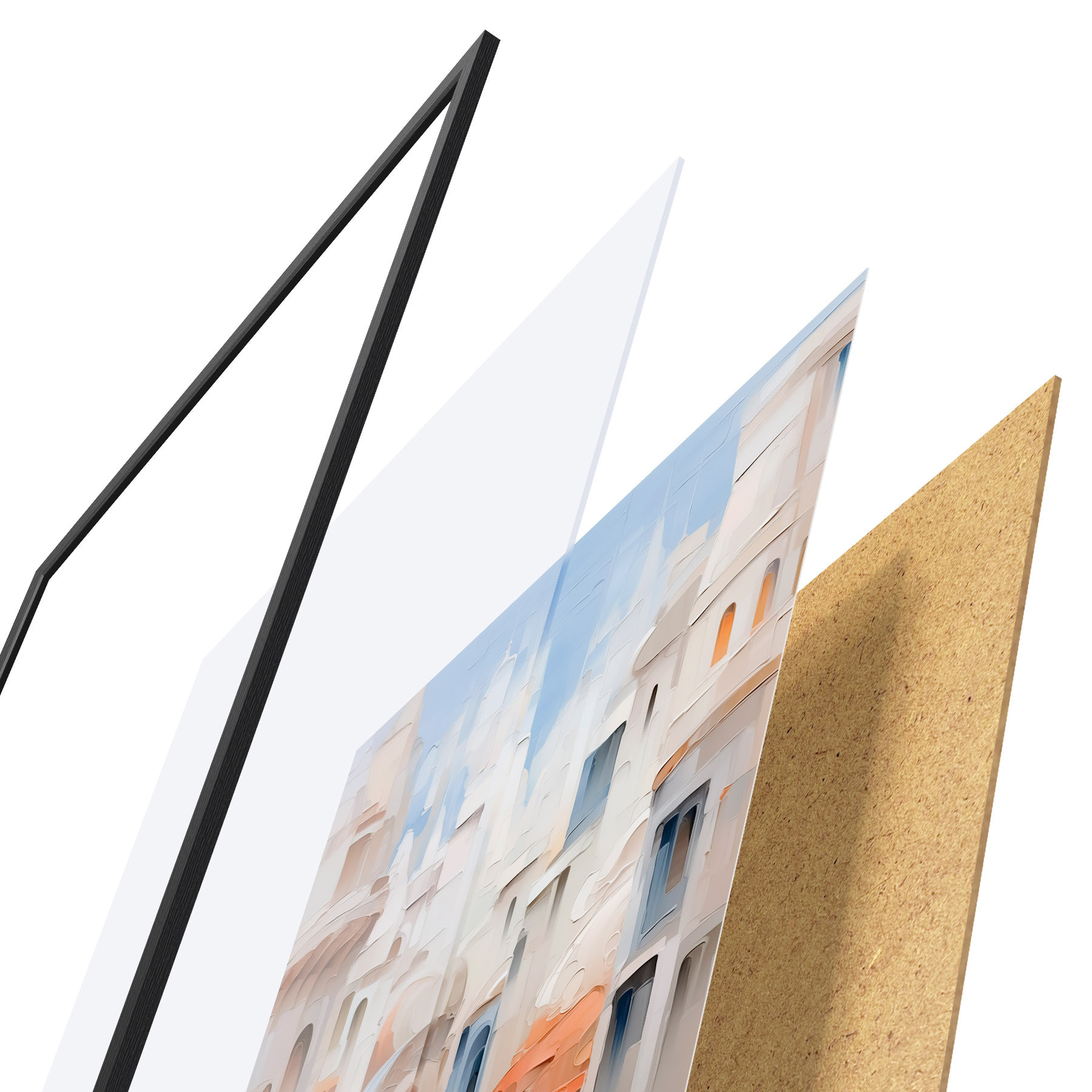 Le poster se compose d'un cadre, d'un plexiglas, d'une image imprimée et d'un support en aggloméré. Le poster peut être immédiatement accroché au mur grâce aux fixations au dos.