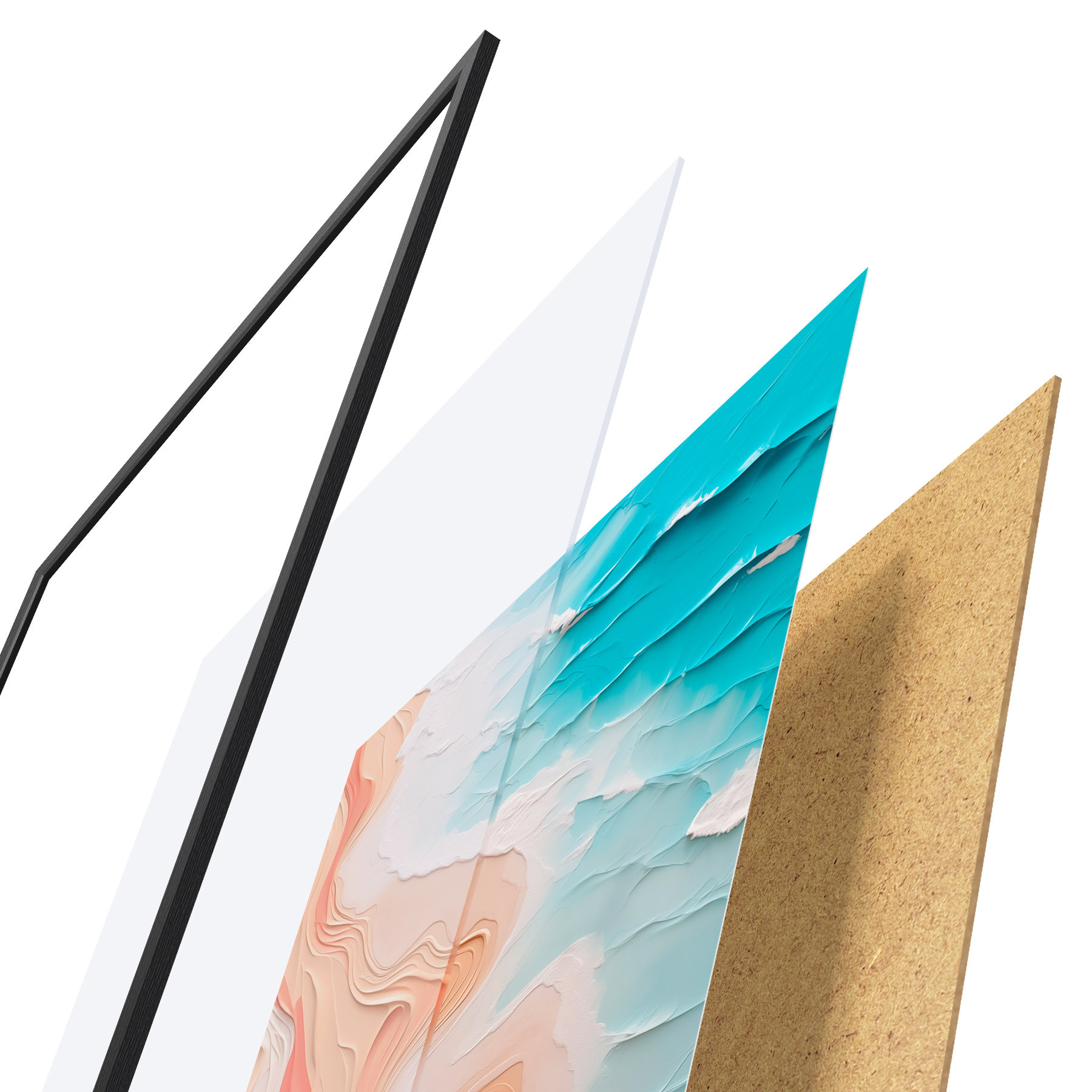 Le poster se compose d'un cadre, d'un plexiglas, d'une image imprimée et d'un support en aggloméré. Le poster peut être immédiatement accroché au mur grâce aux fixations au dos.