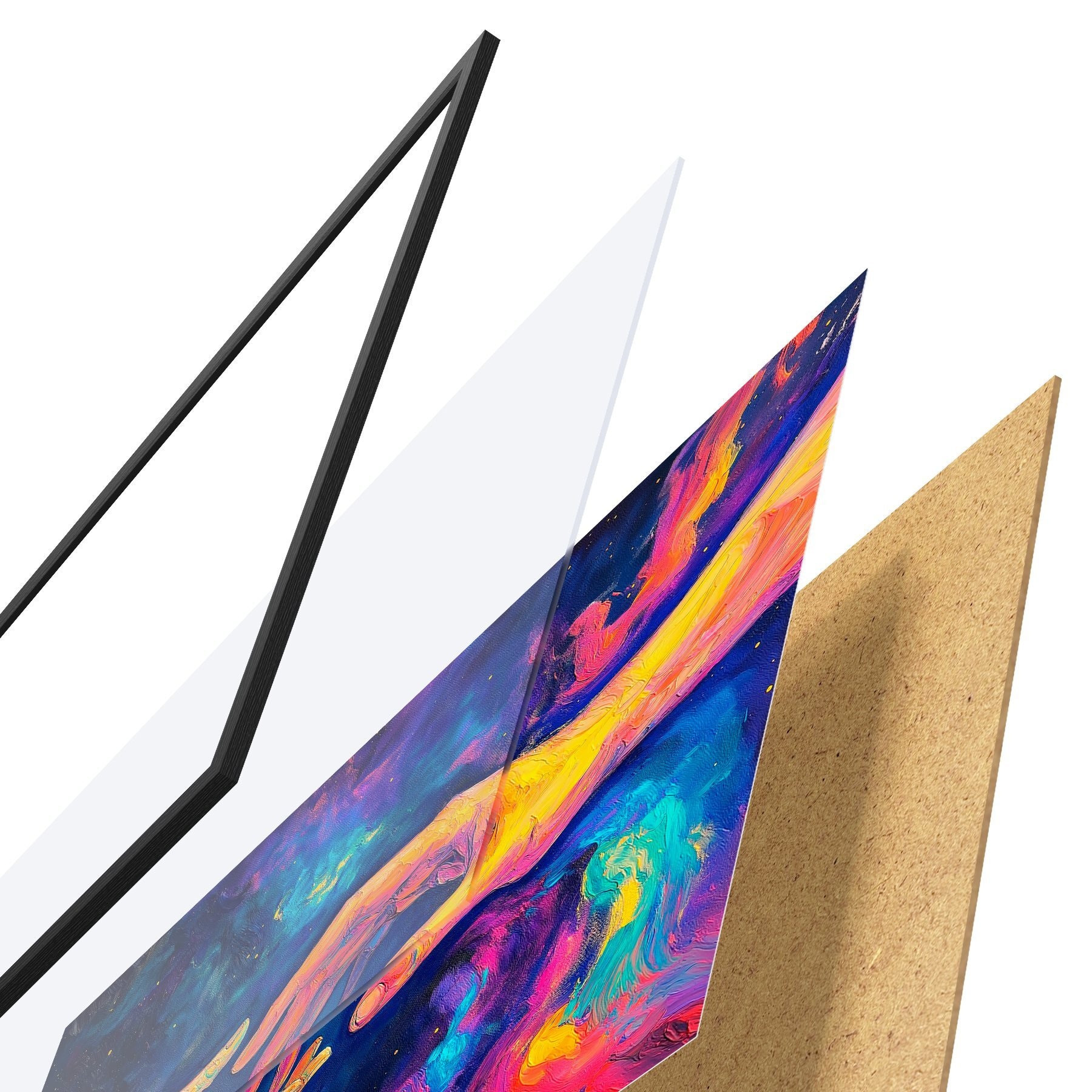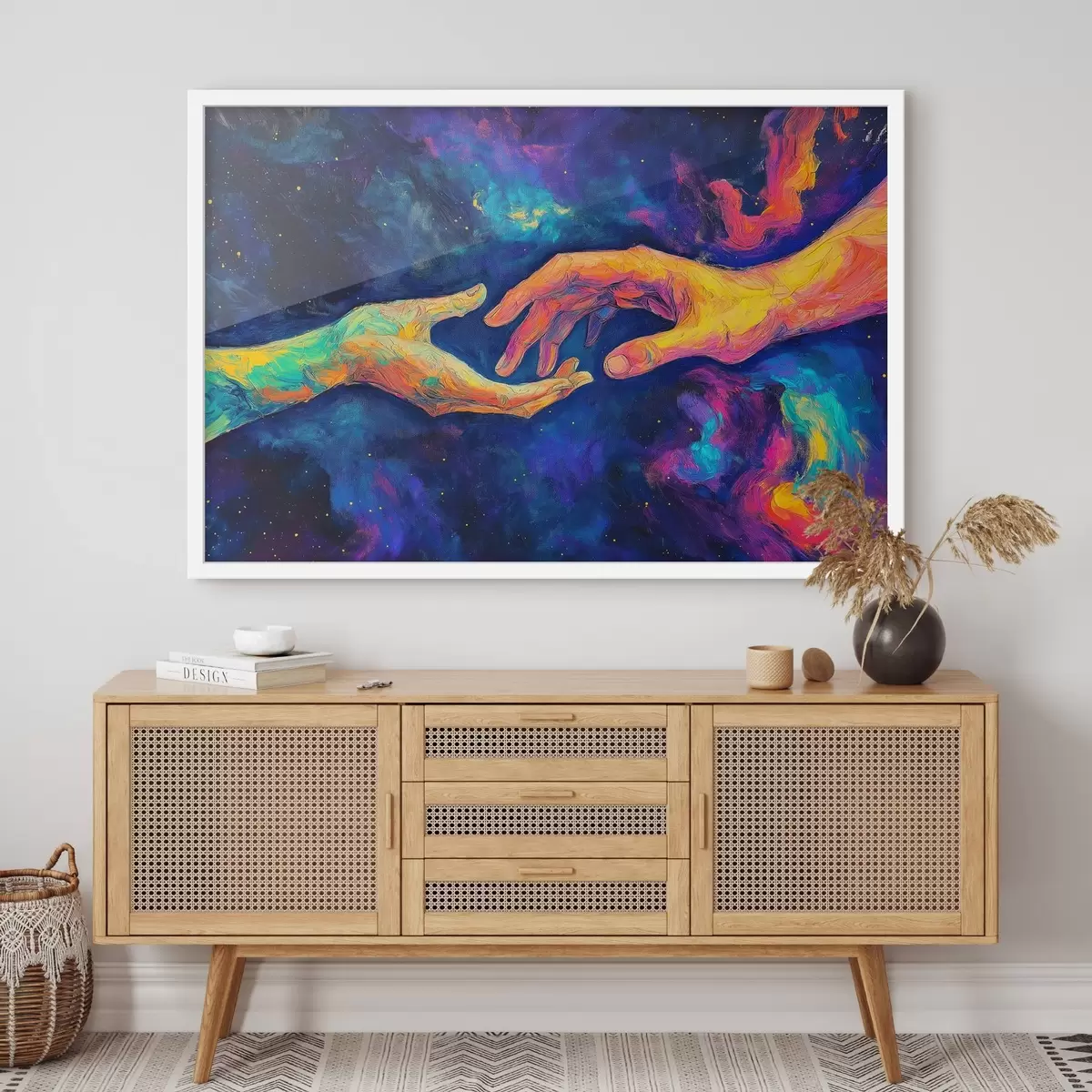 Affiche Composition abstraite de deux mains qui se tendent l'une vers l'autre, dans une palette de couleurs vibrantes sur un fond cosmique f42937