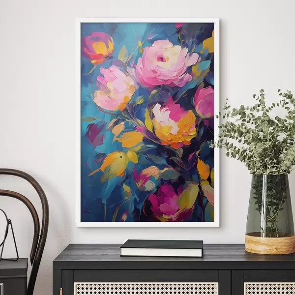 Affiche Peinture abstraite avec des fleurs vibrantes sur fond bleu Non f42941