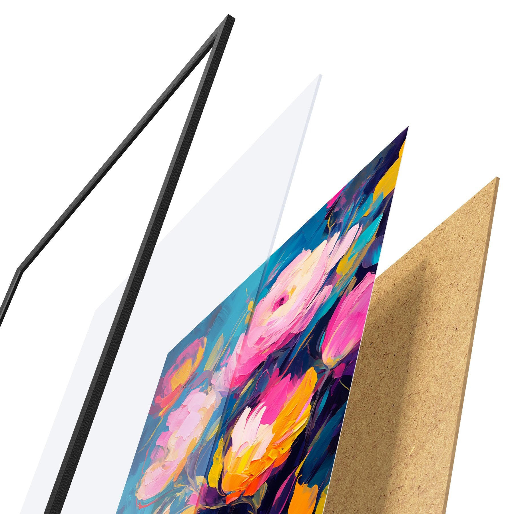 Le poster se compose d'un cadre, d'un plexiglas, d'une image imprimée et d'un support en aggloméré. Le poster peut être immédiatement accroché au mur grâce aux fixations au dos.