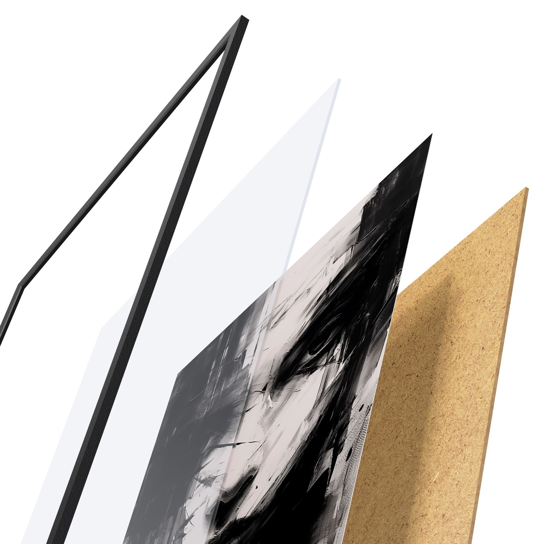 Le poster se compose d'un cadre, d'un plexiglas, d'une image imprimée et d'un support en aggloméré. Le poster peut être immédiatement accroché au mur grâce aux fixations au dos.