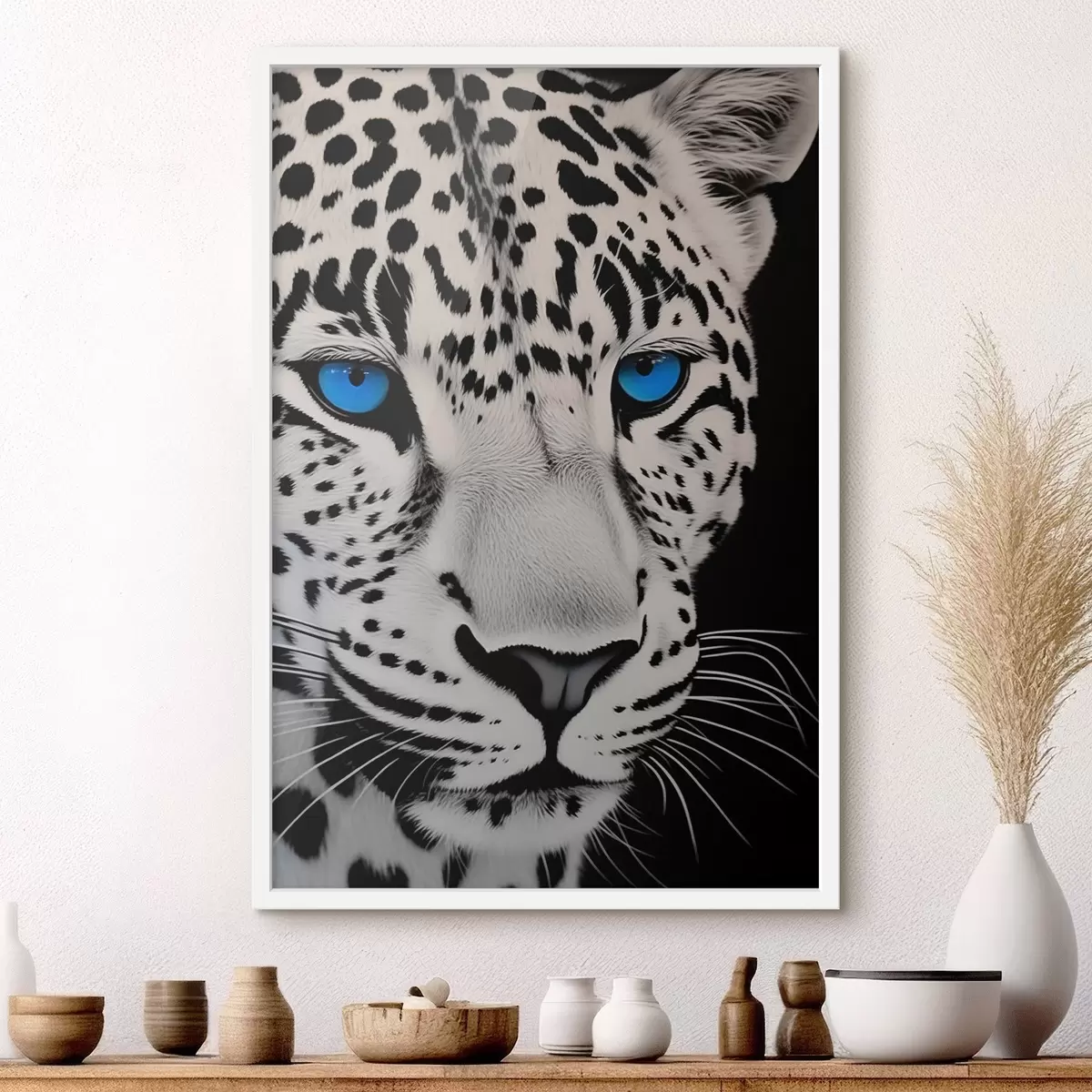 Affiche Portrait en noir et blanc d'un léopard aux yeux bleus Non f43008