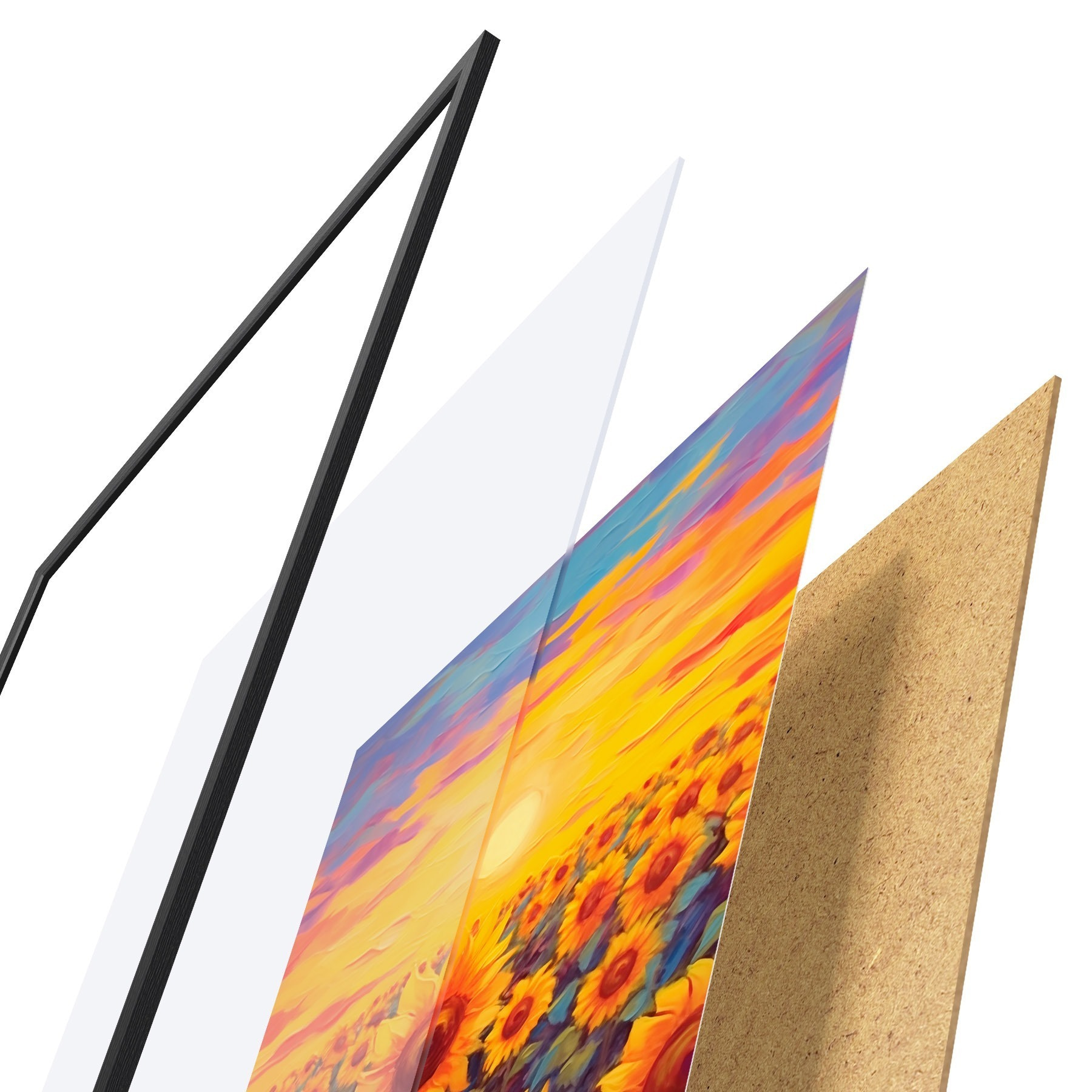 Le poster se compose d'un cadre, d'un plexiglas, d'une image imprimée et d'un support en aggloméré. Le poster peut être immédiatement accroché au mur grâce aux fixations au dos.