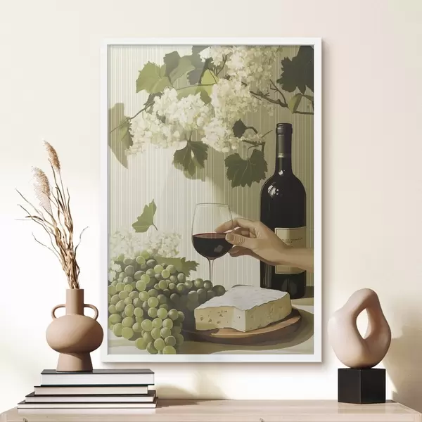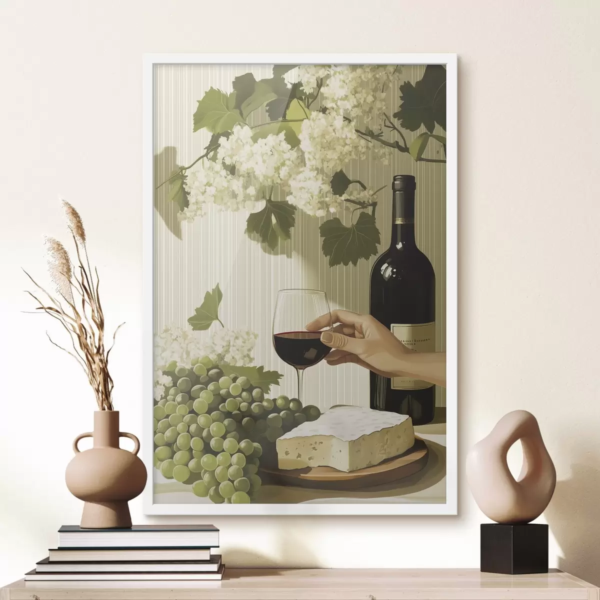 Affiche Raisins avec fromage, bouteille de vin, style vintage, fleurs blanches f43052