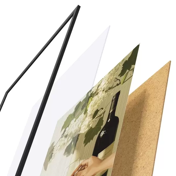 Le poster se compose d'un cadre, d'un plexiglas, d'une image imprimée et d'un support en aggloméré. Le poster peut être immédiatement accroché au mur grâce aux fixations au dos.