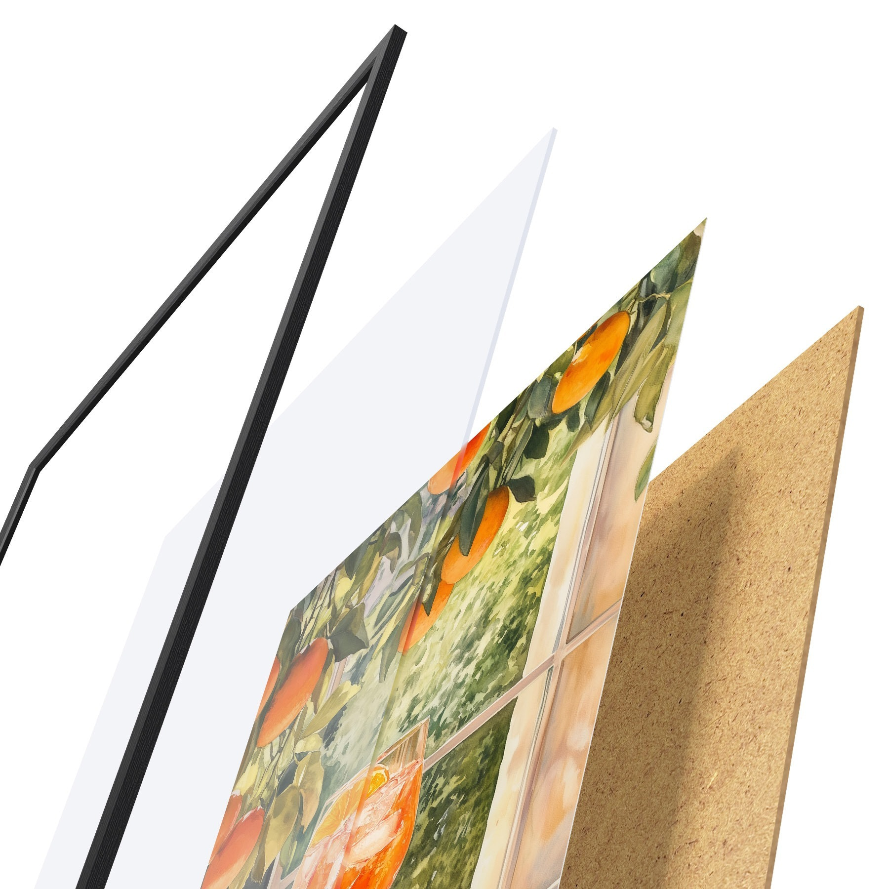 Le poster se compose d'un cadre, d'un plexiglas, d'une image imprimée et d'un support en aggloméré. Le poster peut être immédiatement accroché au mur grâce aux fixations au dos.