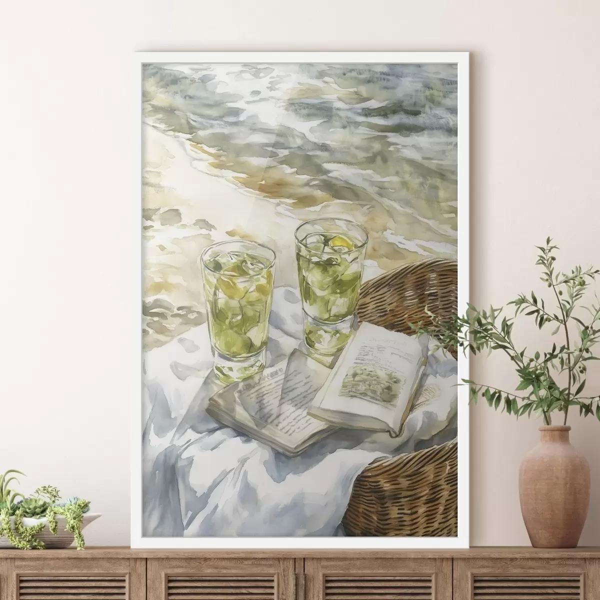 Affiche Pique-nique au bord de la mer, cocktails d'été, poésie, style aquarelle Non f43068