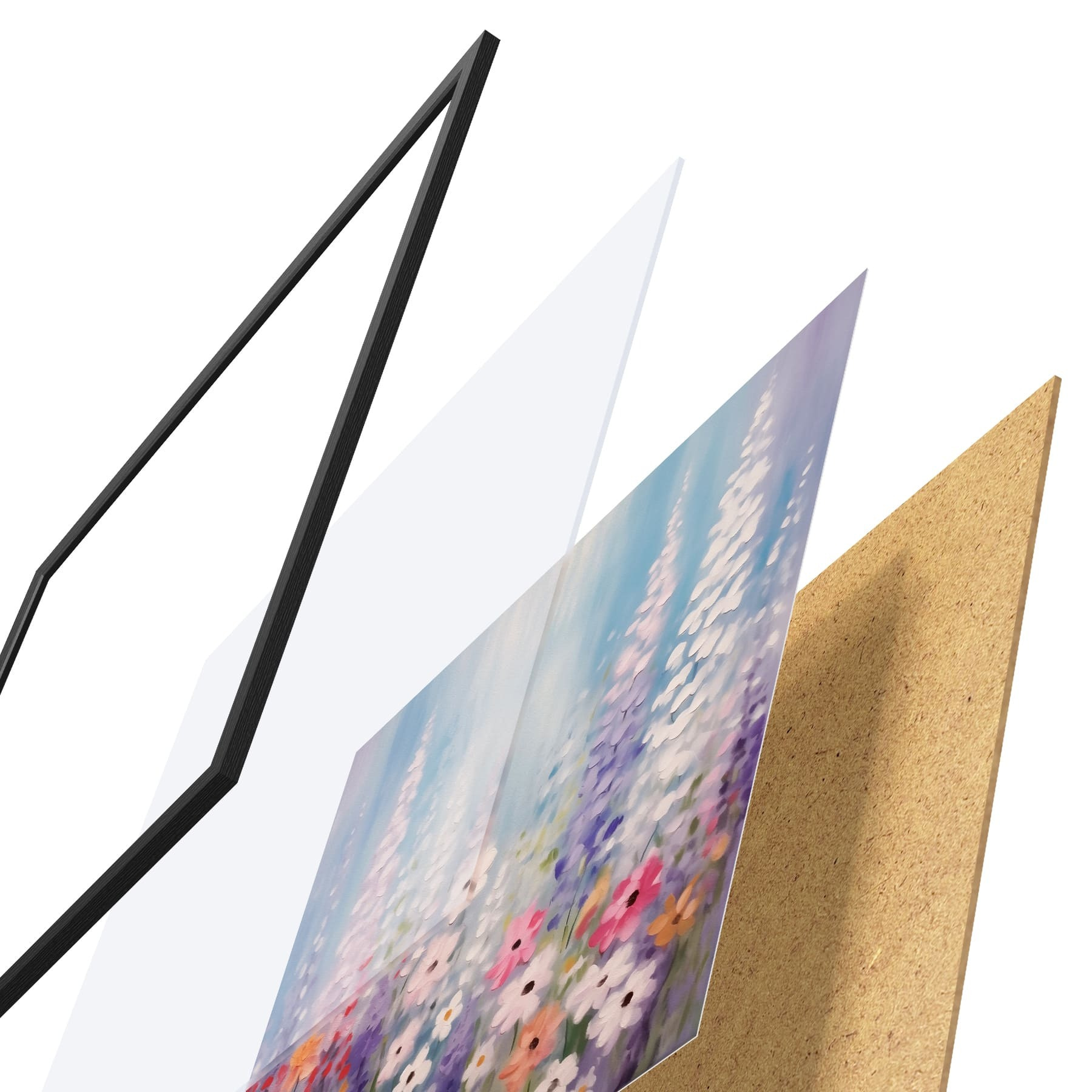 Le poster se compose d'un cadre, d'un plexiglas, d'une image imprimée et d'un support en aggloméré. Le poster peut être immédiatement accroché au mur grâce aux fixations au dos.