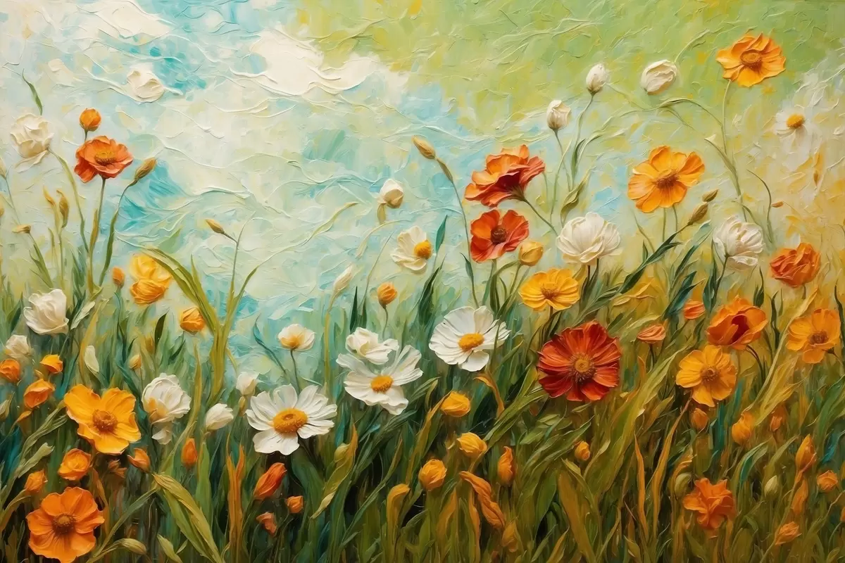 Affiche Champ de fleurs sur fond de ciel bleu abstrait Non f43100