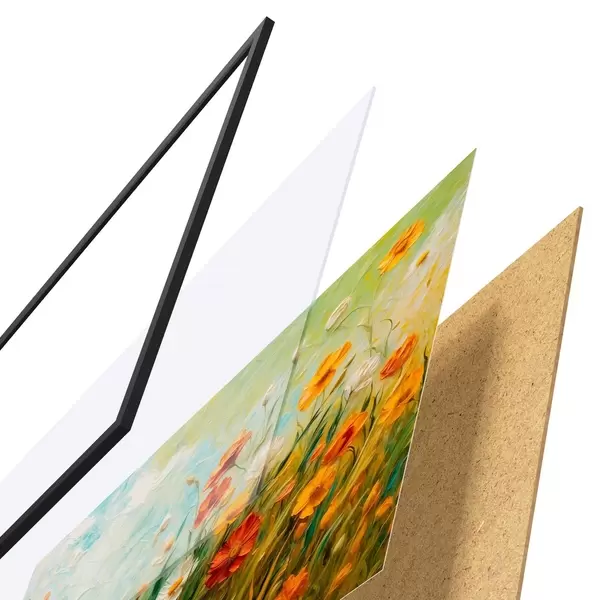 Le poster se compose d'un cadre, d'un plexiglas, d'une image imprimée et d'un support en aggloméré. Le poster peut être immédiatement accroché au mur grâce aux fixations au dos.