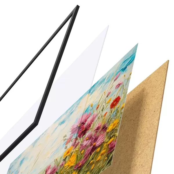Le poster se compose d'un cadre, d'un plexiglas, d'une image imprimée et d'un support en aggloméré. Le poster peut être immédiatement accroché au mur grâce aux fixations au dos.