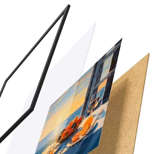 Le poster se compose d'un cadre, d'un plexiglas, d'une image imprimée et d'un support en aggloméré. Le poster peut être immédiatement accroché au mur grâce aux fixations au dos.