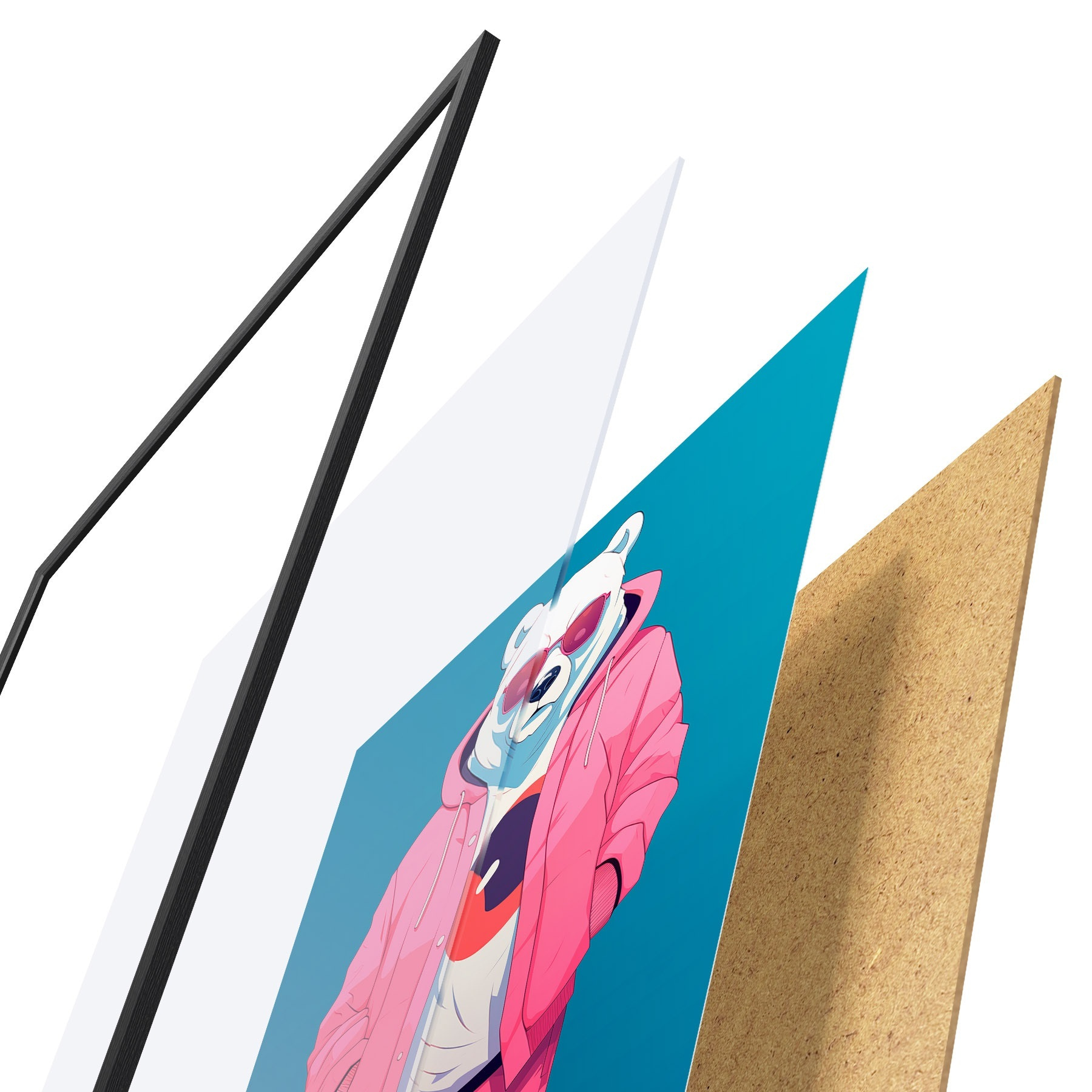 Le poster se compose d'un cadre, d'un plexiglas, d'une image imprimée et d'un support en aggloméré. Le poster peut être immédiatement accroché au mur grâce aux fixations au dos.