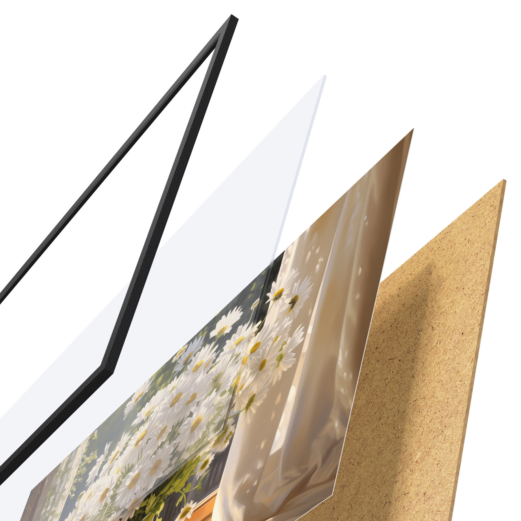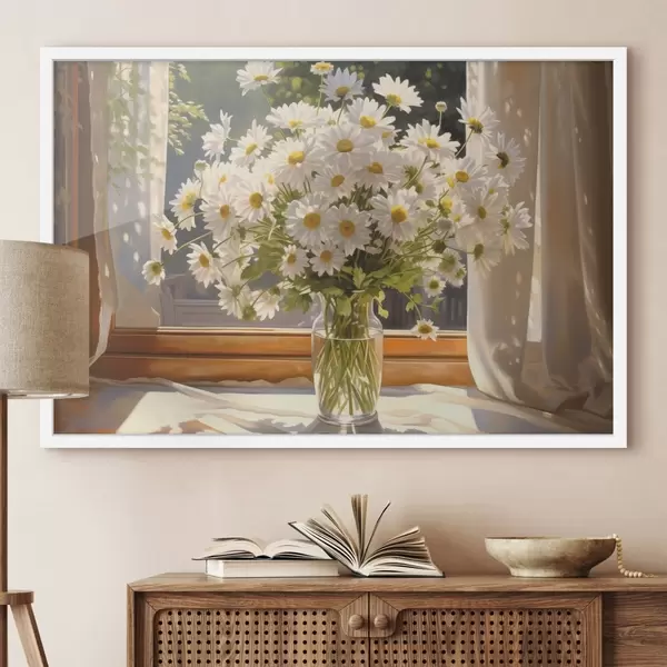 Affiche Peinture à l'huile imitant un vase avec des marguerites blanches sur un rebord de fenêtre, journée ensoleillée, palette de couleurs chaudes Non f43171