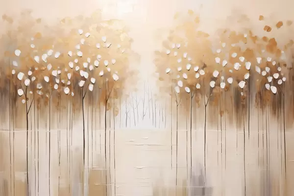 Affiche Peinture à l'huile imitant des arbres bruns avec des feuilles blanches dans une forêt avec une rivière au milieu, fond blanc Non f43172