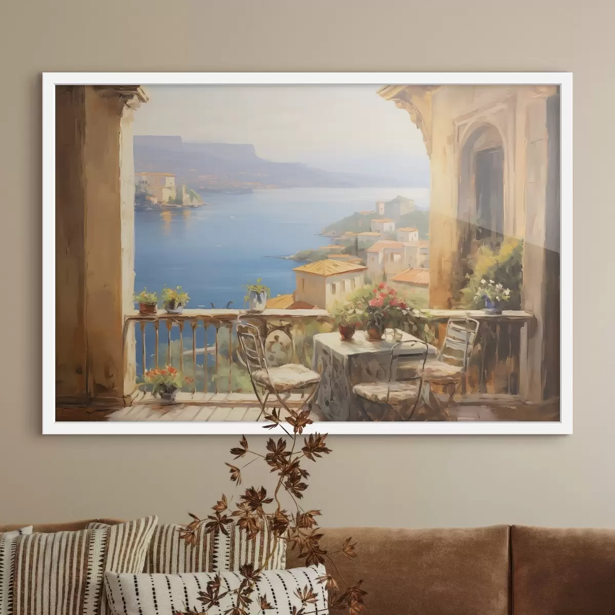 Affiche Peinture à l'huile imitation balcon avec fleurs, vue sur la mer, maisons sur la côte, journée ensoleillée, ciel bleu Non f43173