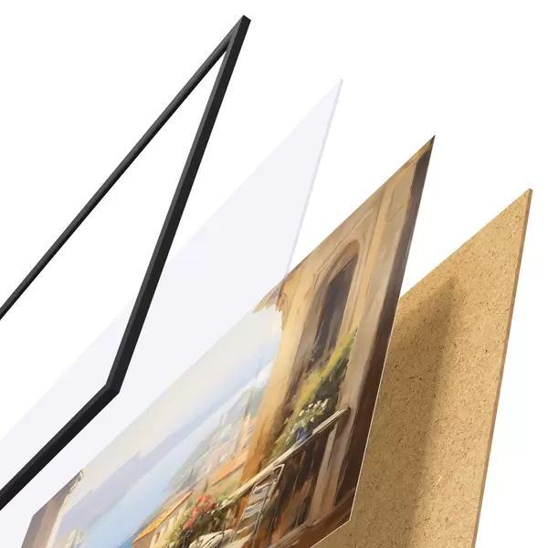 Le poster se compose d'un cadre, d'un plexiglas, d'une image imprimée et d'un support en aggloméré. Le poster peut être immédiatement accroché au mur grâce aux fixations au dos.