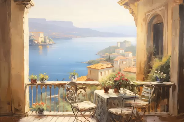 Affiche Peinture à l'huile imitation balcon avec fleurs, vue sur la mer, maisons sur la côte, journée ensoleillée, ciel bleu Non f43173
