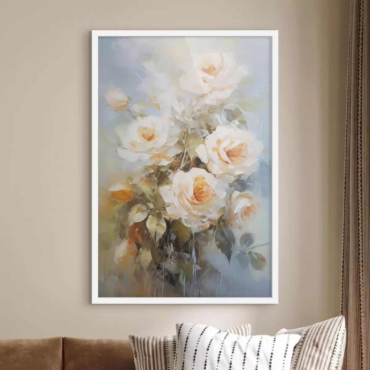 Affiche Roses blanches avec orange, sur un fond bleu clair doux, avec des coups de pinceau visibles et un style pictural f43175
