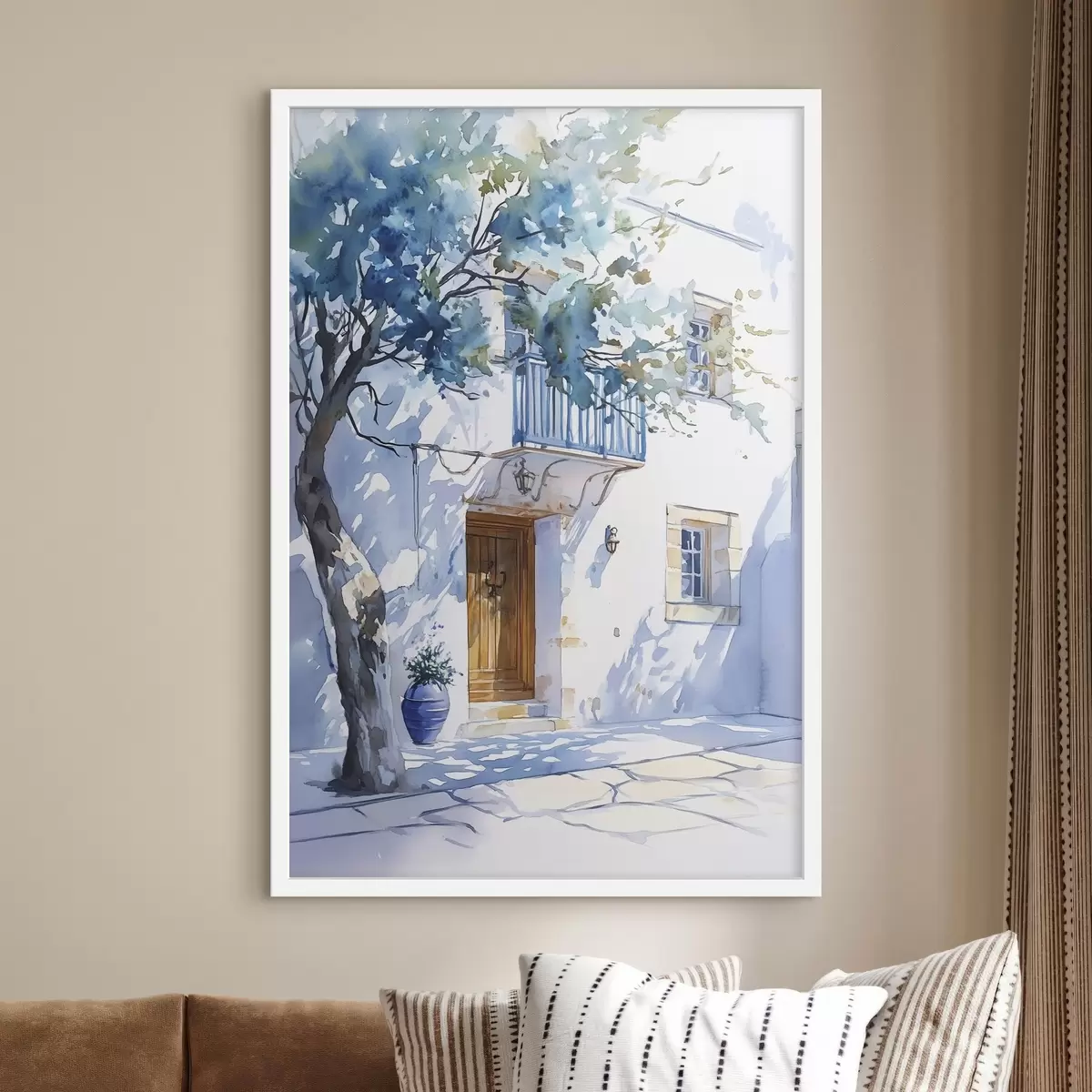 Affiche Aquarelle, maison grecque, arbre en fleurs, architecture f43182