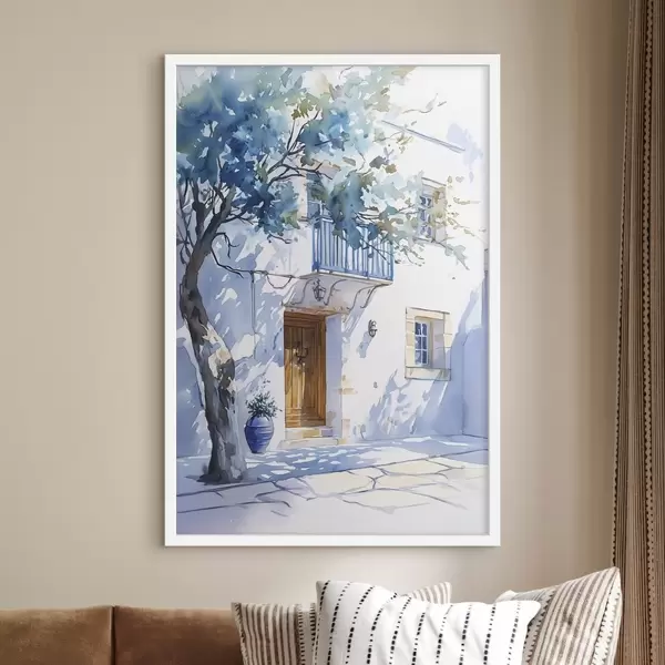 Affiche Aquarelle, maison grecque, arbre en fleurs, architecture Non f43182