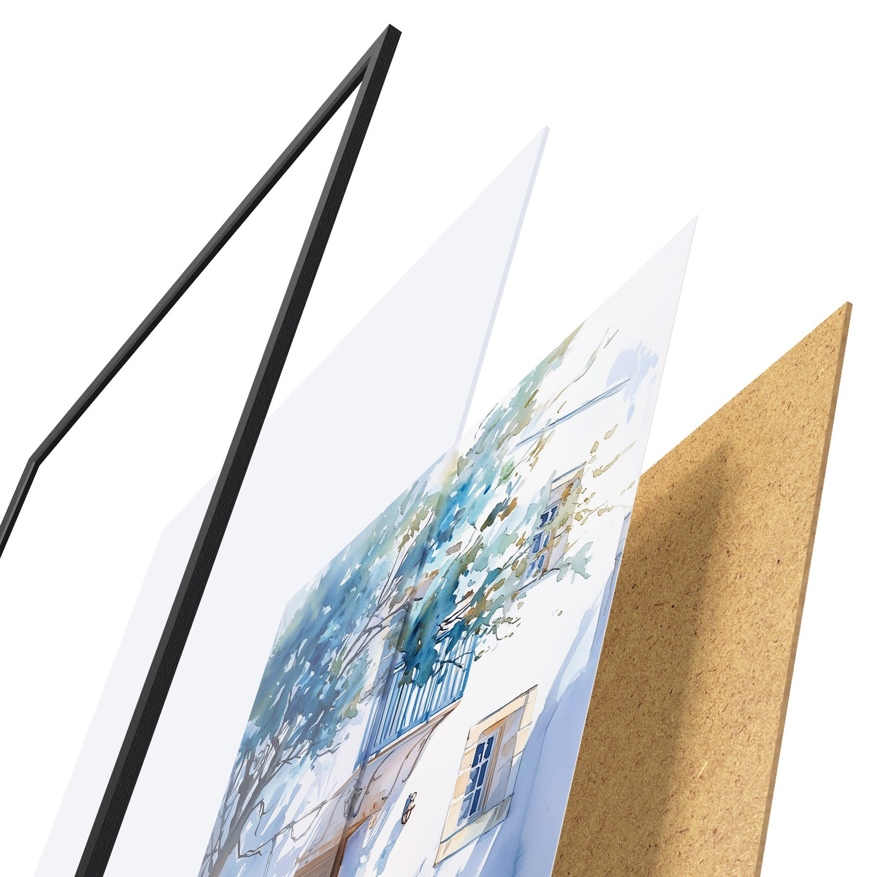 Le poster se compose d'un cadre, d'un plexiglas, d'une image imprimée et d'un support en aggloméré. Le poster peut être immédiatement accroché au mur grâce aux fixations au dos.