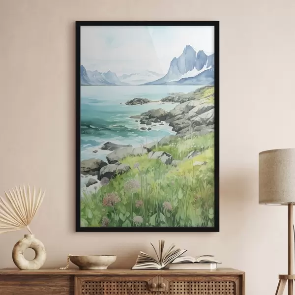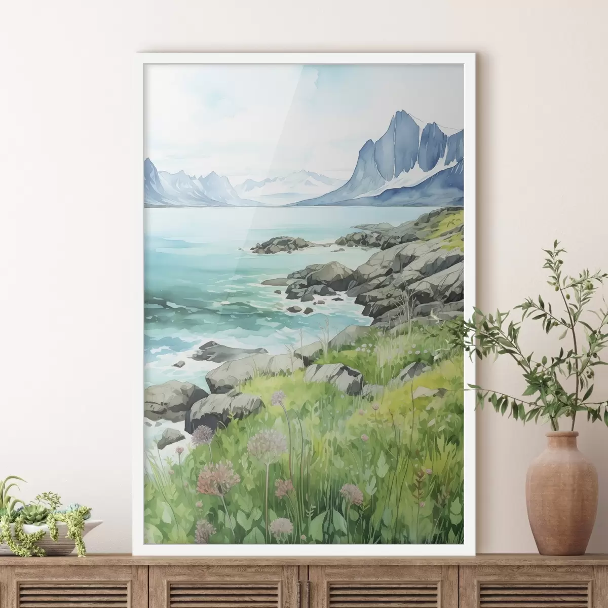 Affiche Norvège nature, fjords, paysage d'été, herbe verte, montagnes, style aquarelle f43188
